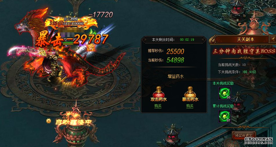 天关是80级开放闯天关副本,会在开服的第五天开启该玩法,玩家可以到边境小城找到NPC【天关】来进入挑战,不过挑战每一关时玩家只有3分钟时间,如果超过时间则会挑战失败,但失败的话也不用担心,可以重新进行挑战,而且这个天关挑战会在每天的凌晨重置天关挑战层数,玩家每天都可以重新挑战该天关。 |